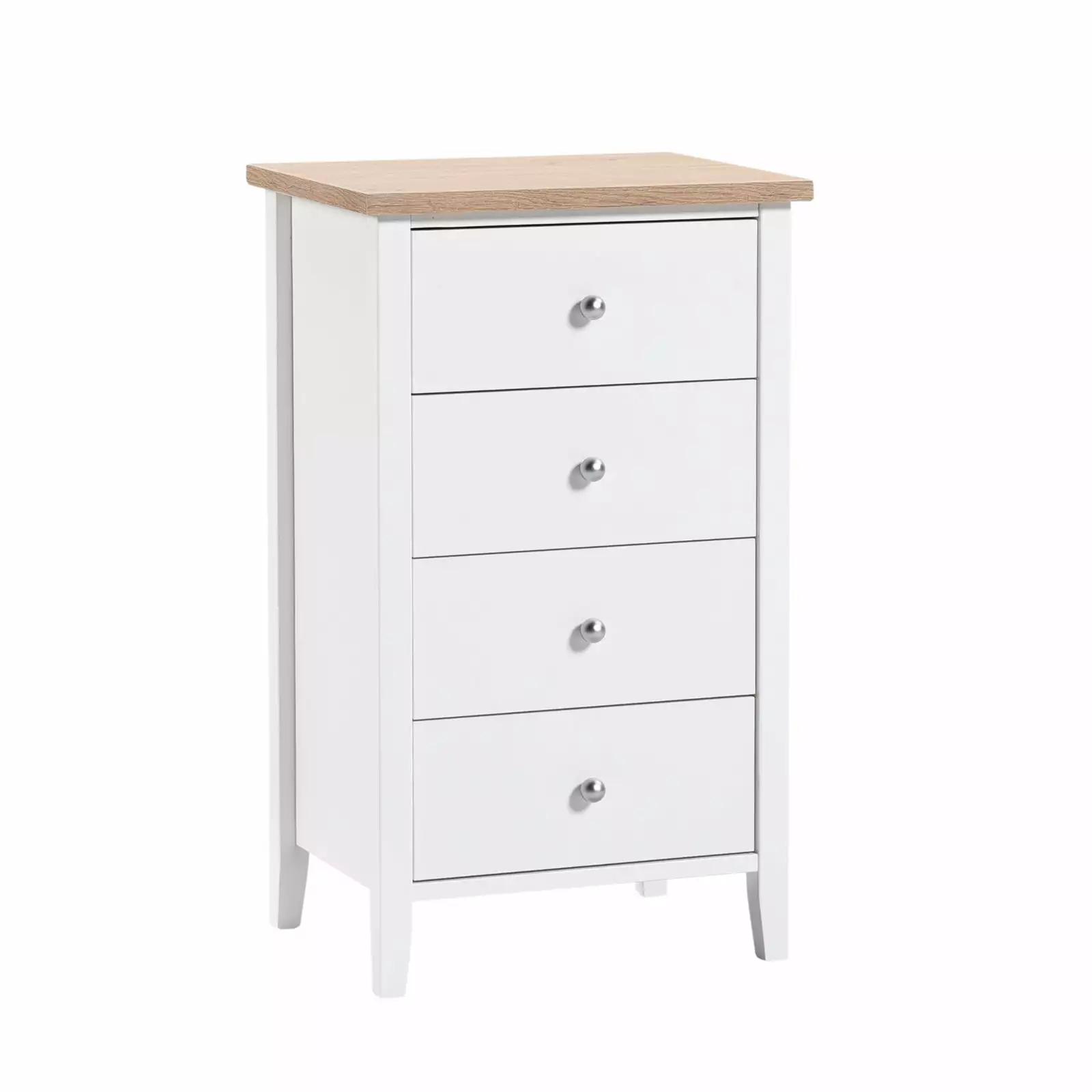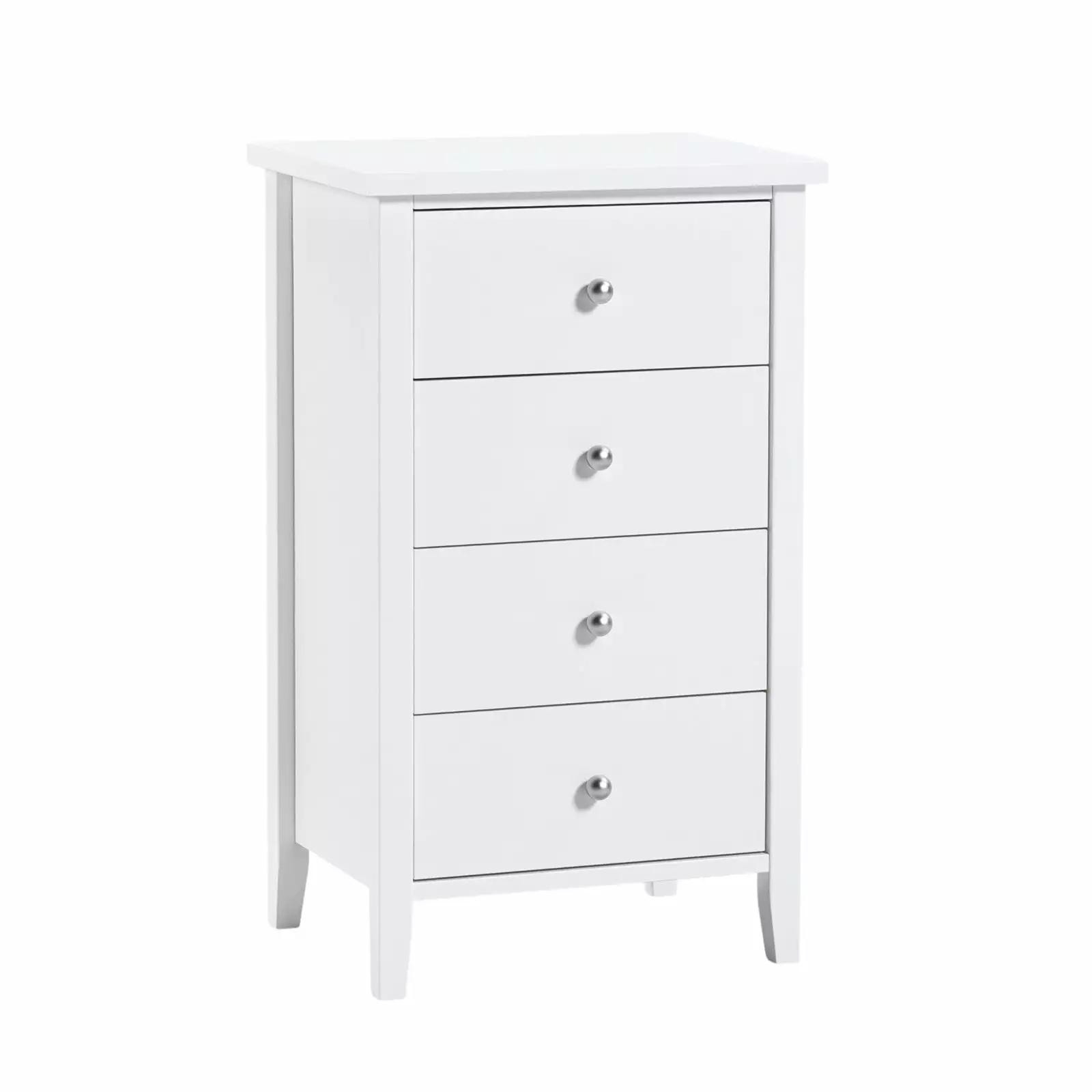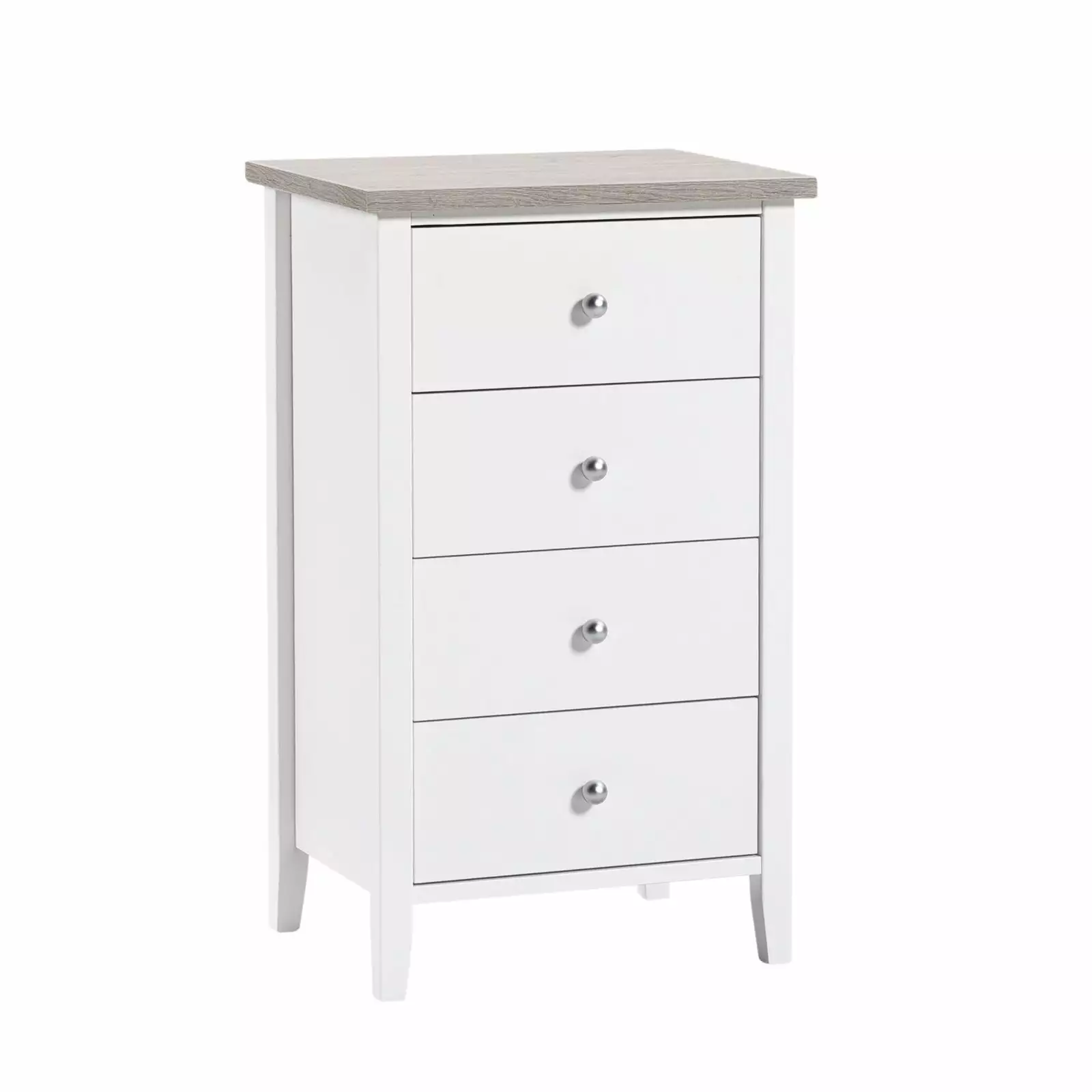 Klassisen tyylikäs, peiliovimallisen Saara-sarjan ihastuttava valkoinen korkea laatikosto. Sarjan kalusteisiin saat erilaista ilmettä kannen värin valinnalla – kokovalkoisen sijaan kalusteen kansilevyn voit valita valkosaarnin tai tammen värisenä. Saara-kalusteissa tyyliteltyä ulkonäköä tuovat myös hopeanväriset pallovetimet ja korkeat jalat. Saara-kalustesarjasta löytyvät erilaiset säilytysratkaisut ja saat kodin säilytystilatarpeet ratkaistua yhteneväisesti ja edullisesti.