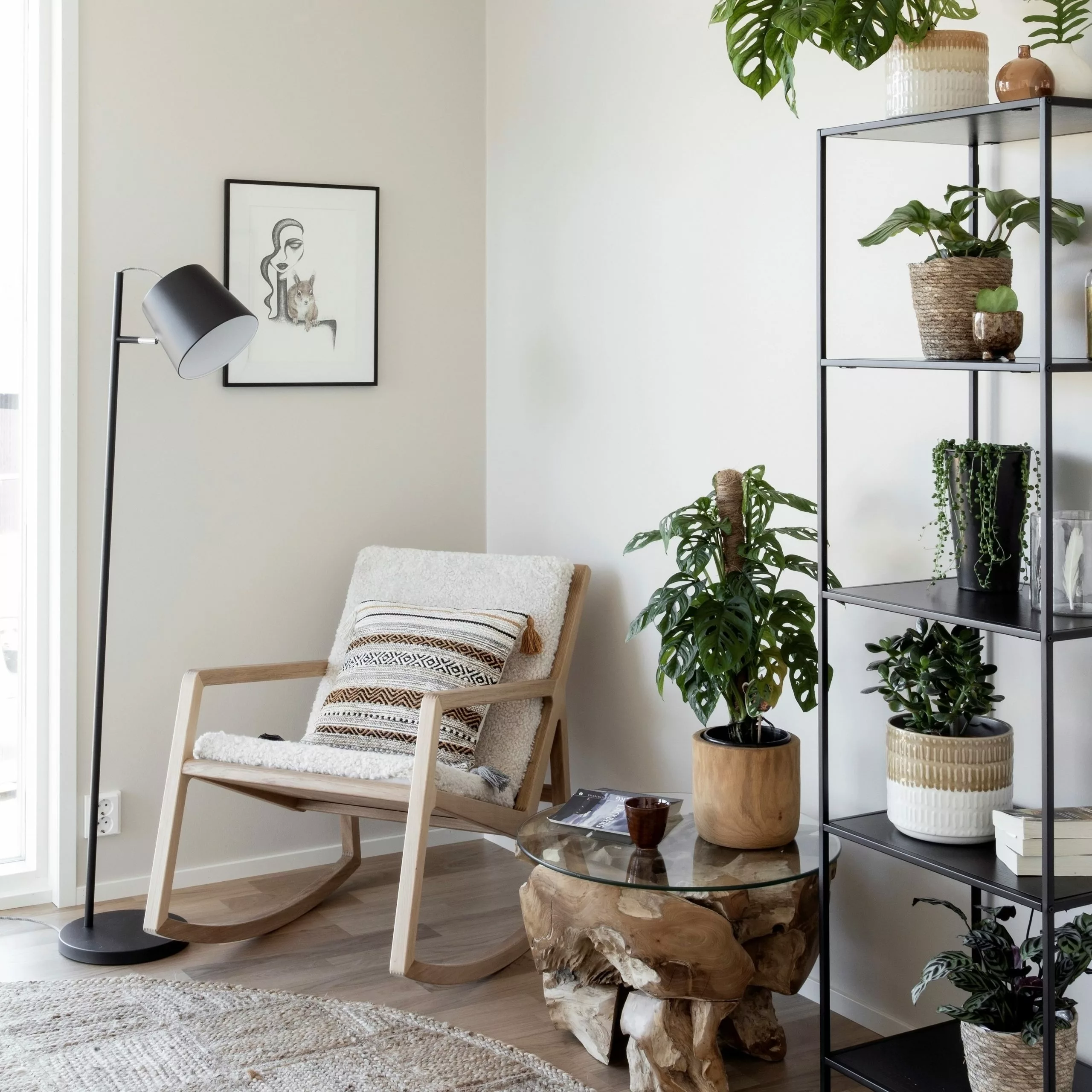 Avohyllyn kapea runko antaa sille hyvin keveän ilmeen. Hyllytasot ovat mustaa tai tammenväristä huonekalulevyä ja runko on mustaksi maalattua metallia.