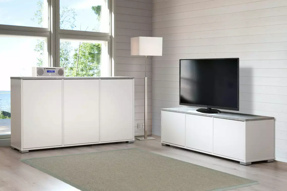 Kivi-sarjan kapea tv-taso toimii myös näppäränä tasona, joka tuo kätevää säilytys- ja laskutilaa eri tiloihin. Kivi-tv-tason avulla television ja oheislaitteet saa sijoiteltua parhaalla mahdollisella tavalla. Viihdekeskuksessa on tilaa medialaitteille tasotilan lisäksi kolmen ovikaapin verran, joissa kaikissa on johtoaukot kaapeleille. Kaikkia kaappitiloja saa säädeltyä sopiviksi siirrettävillä välihyllyillä.