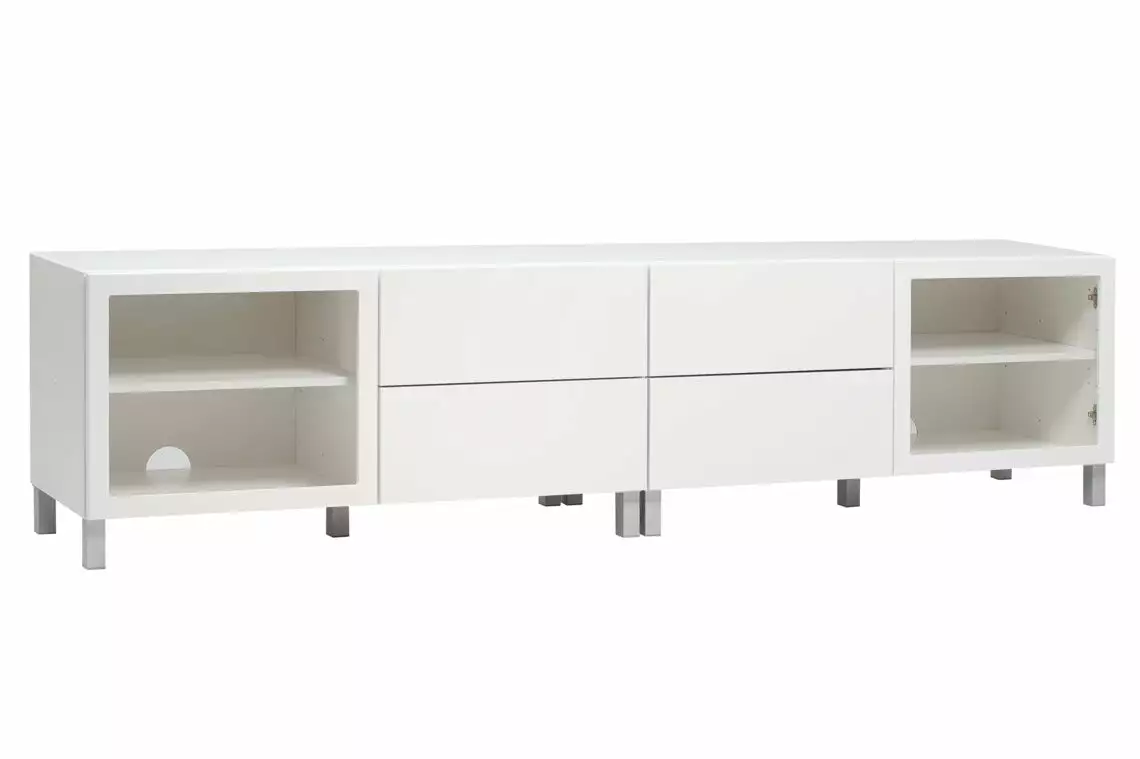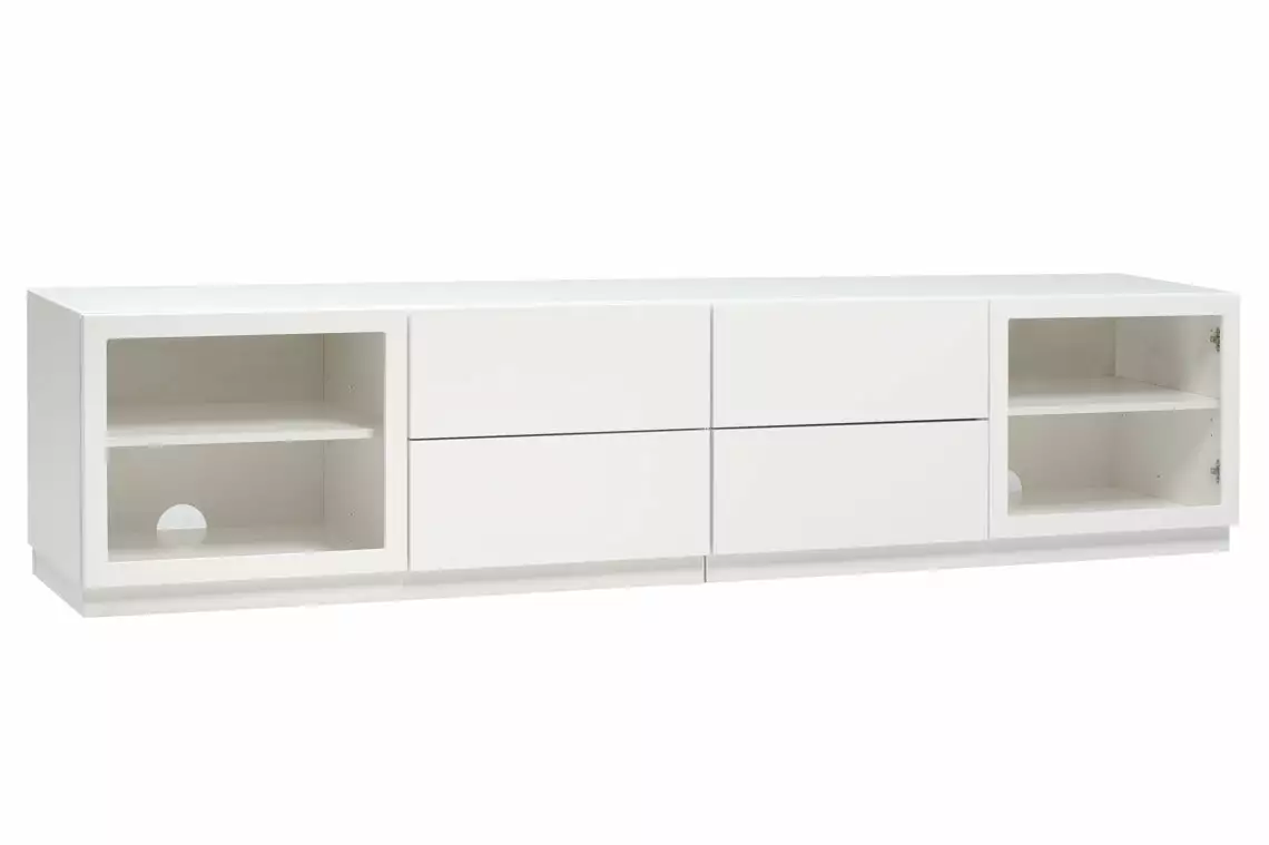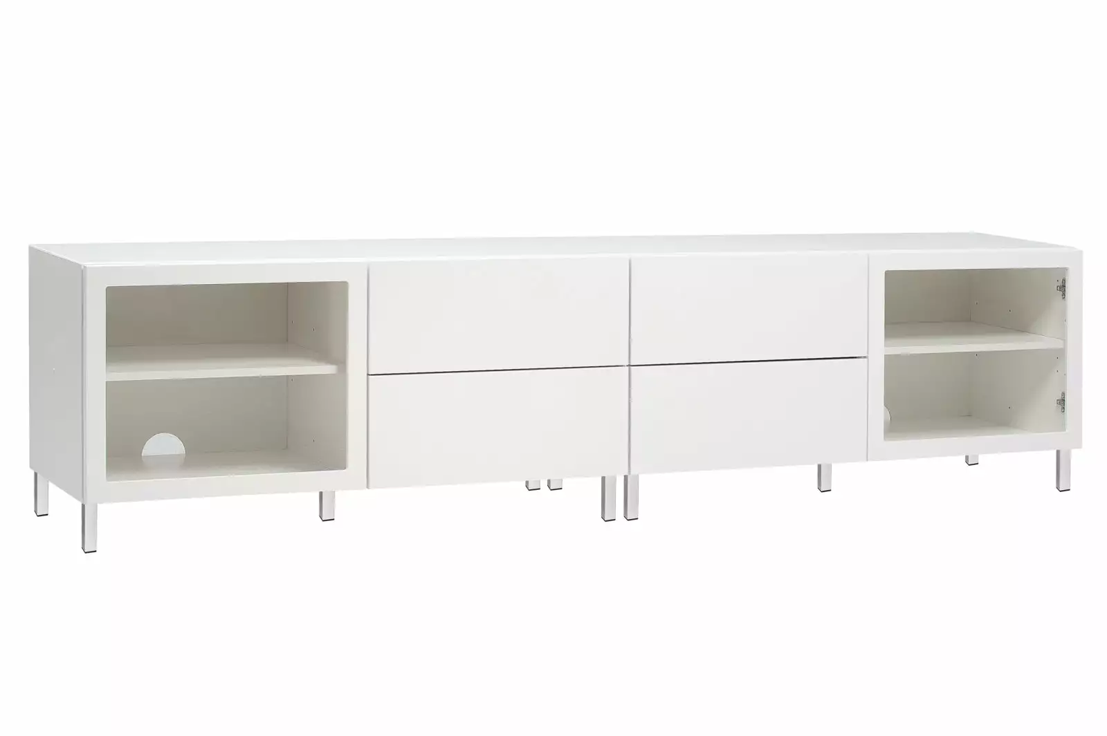 Lumo-sarjan ihastuttava kahdesta tasosta koostuva, kokopitkän irrallisen lasikannen yhdistämä tv-taso. Leveässä tasossa on oikeanlaiset säilytystilat medialaitteille, läpiviennit johdoille sekä tietenkin sopivasti tilaa tv:lle ja mahdollisille oheislaitteille. Sivuilla olevissa kaapeissa on lasiovet kirkkaalla lasilla ja tason keskiosassa on laatikosto. Voit valita tv-tason joko 5,5 cm korkealla jalkasokkelilla tai 10 cm korkeilla jaloilla. Malliston eri osista yhdistelemällä saa koottua yksilöllisiä ja toimivia kokonaisuuksia.