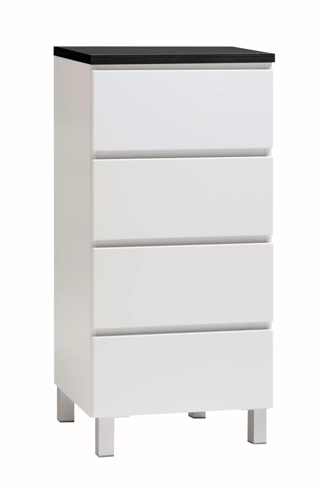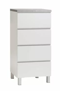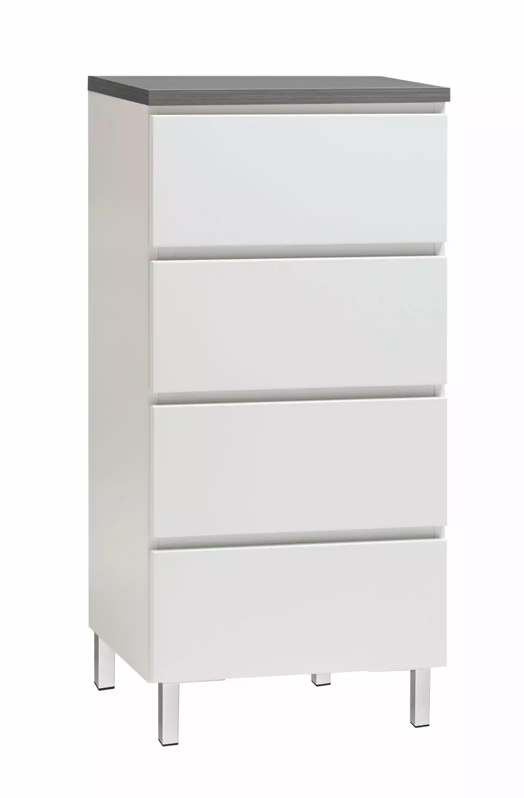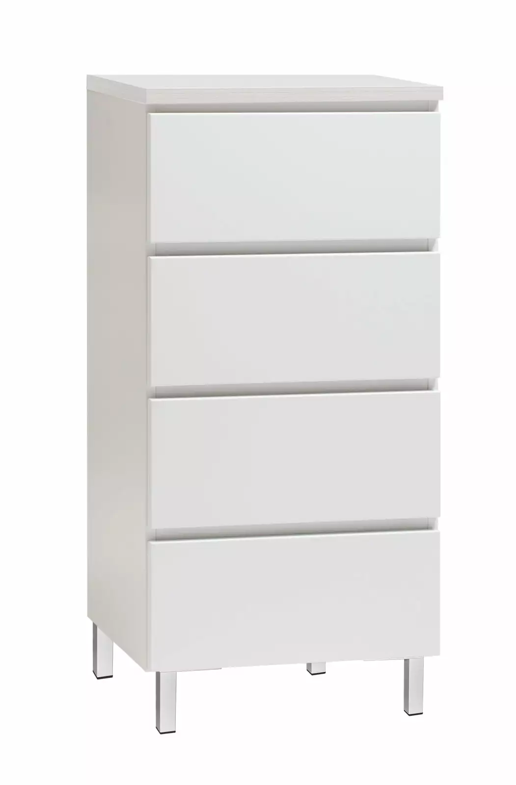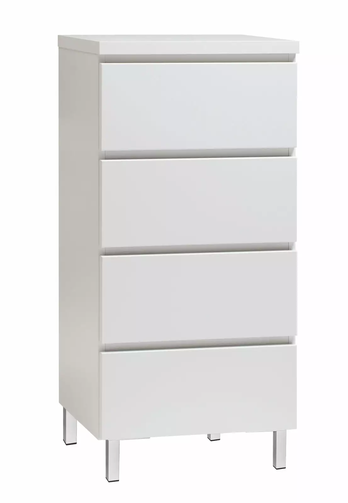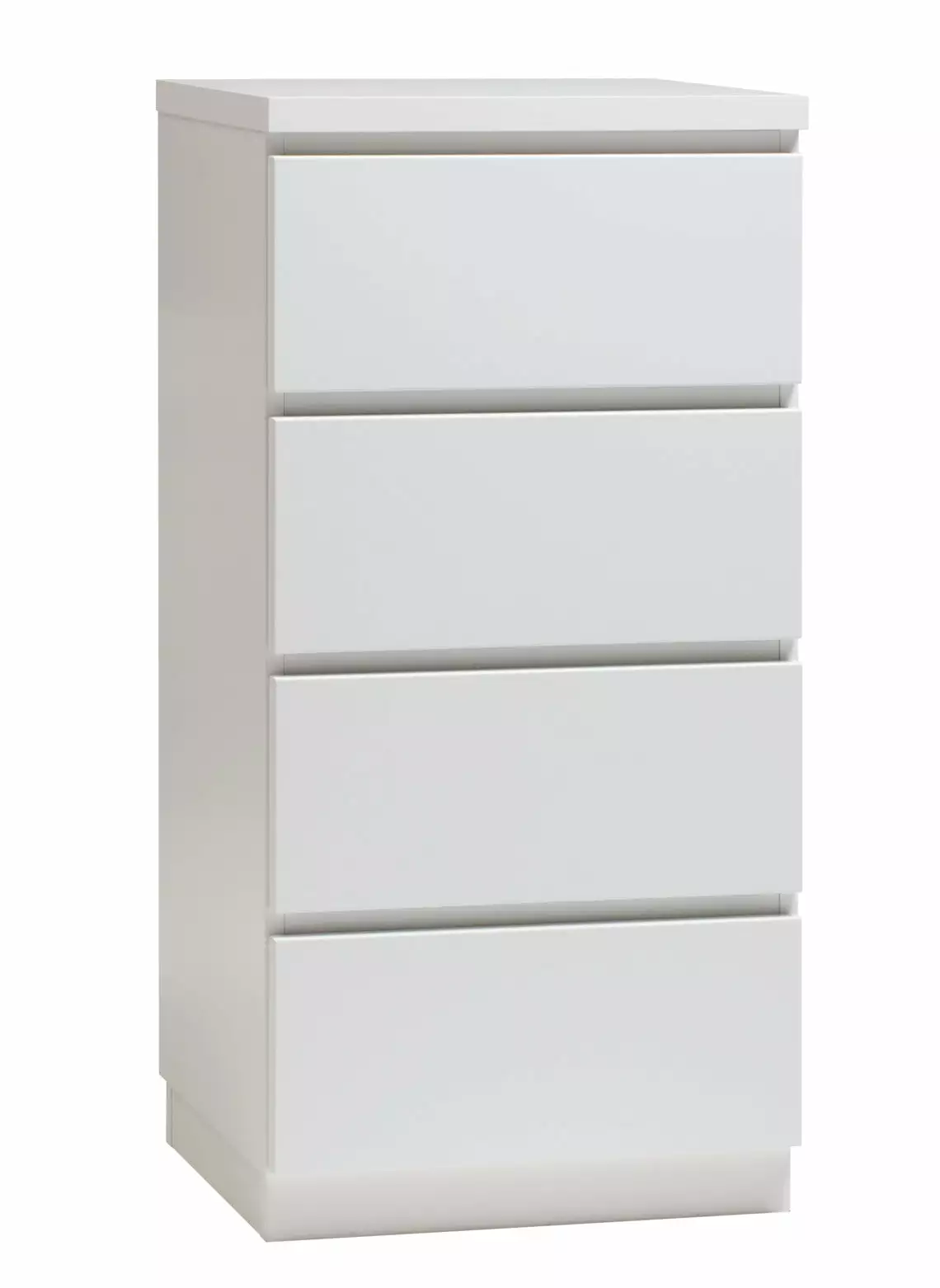 Korkea Viiva-lipasto sopii vaikka yöpöydäksi. Voit valita Viiva-lipaston joko 5,5 cm korkealla jalkasokkelilla, tai 10 cm korkeilla jaloilla. Laatikostoon on saatavana lisävarusteena myös valkoinen karkaistu lasikansi.