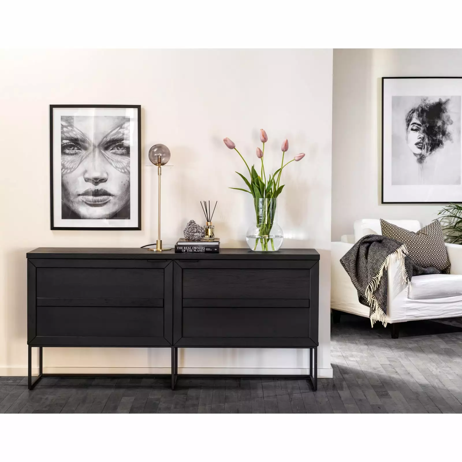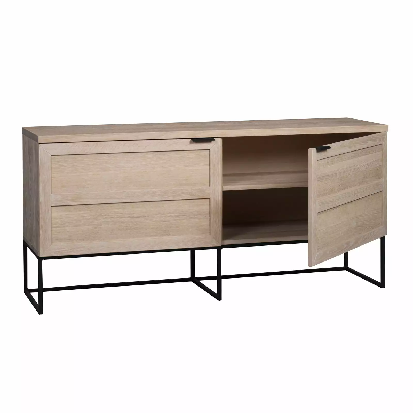 Everett-senkki on näyttävä säilytyskokonaisuus, joka sopii kaikkiin kodin oleskelutiloihin. Matala sivutaso on valmistettu vaaleasta tai mustaksi lakatusta harjatusta luonnonmukaisesta tammesta ja sen ohuet metallijalat tuovat muuten jykevään säilytyskalusteeseen ilmavuutta ja helpottavat siivousta, sekä keventävät ulkoasua.