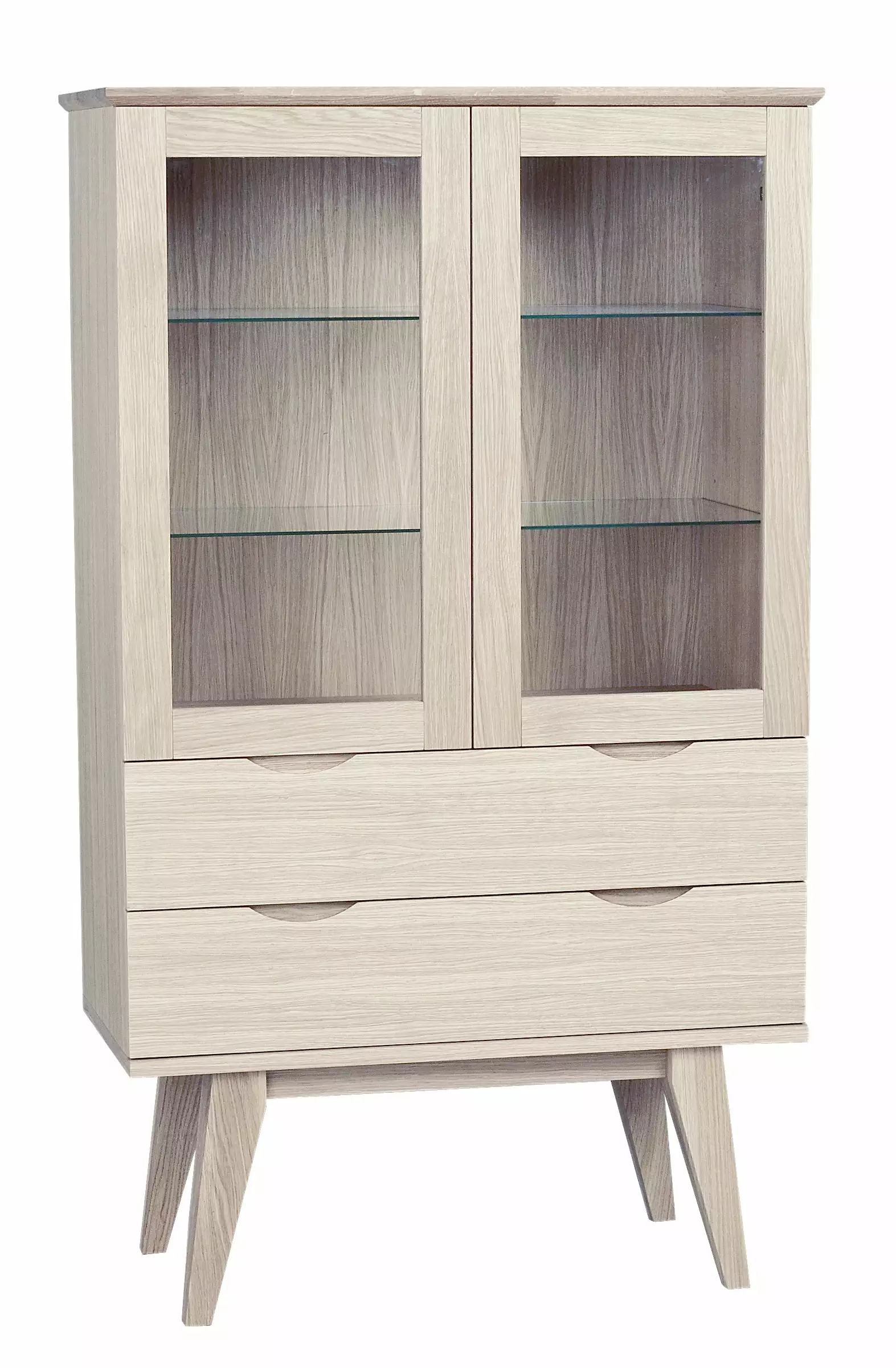 Tilava lasivitriini Filippa-mallistosta sopii kodin oleskelu- ja ruokailutiloihin. Vitriinin levenevät viistomaiset jalat keventävät ulkoasua ja tuovat siihen samalla ripauksen moderniutta. Filippa-vitriinissä on pehmeästi sulkeutuvat laatikot ja ovet, jotka vaimentavat ääntä ja estävät naarmuuntumista. Vitriinin yläosassa on kauniit puukehyksiset lasiovet lasihyllyillä ja alaosassa kaksi laatikkoa, missä paljon säilytystilaa astioille tai koriste-esineille.