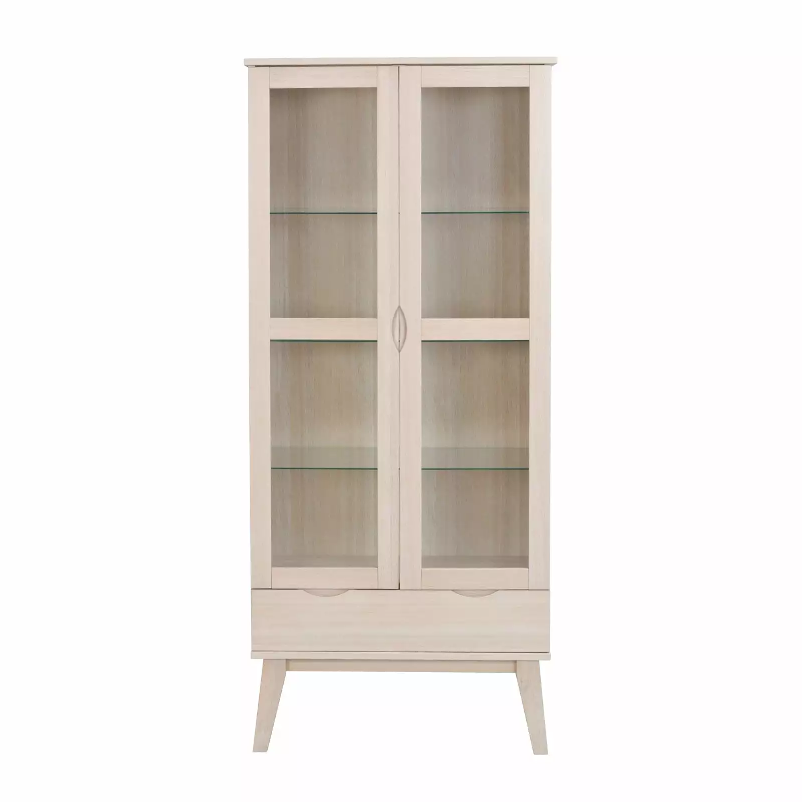 Korkea Filippa-vitriini on näyttävä säilytyskaluste kodin oleskelu- tai ruokailutiloihin. Vitriinin levenevät viistomaiset jalat keventävät ulkoasua ja tuovat siihen samalla ripauksen moderniutta. Filippa-vitriinissä on pehmeästi sulkeutuvat ja ääntä vaimentavat säilytystilojen ovet ja etulevyt. Vitriinin yläosassa on lasihyllyt ja kauniit puukehyksiset lasiovet. Vitriinin alaosassa on laatikko, jossa on paljon säilytystilaa astioille tai koriste-esineille.