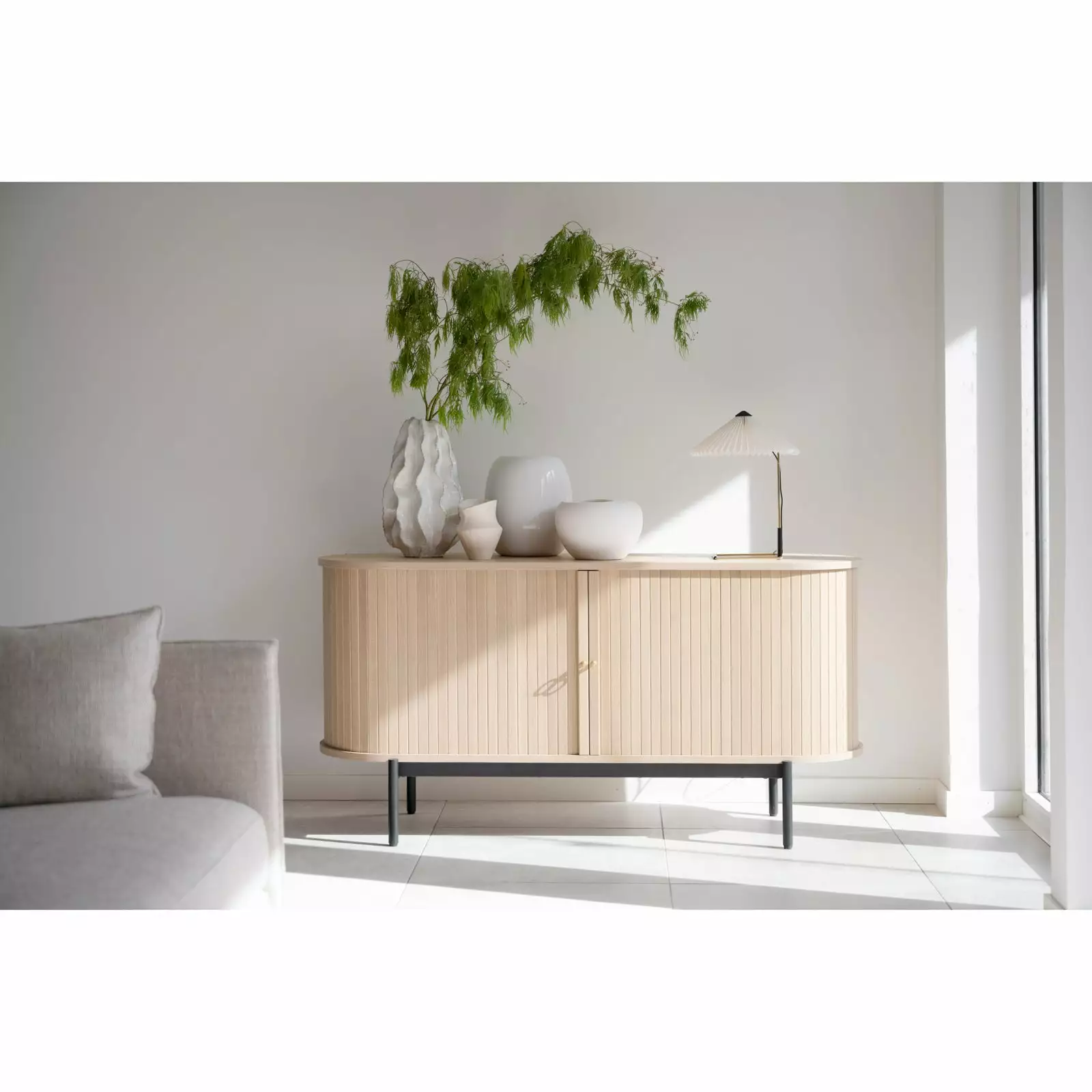 Upeasti muotoiltu Haddington-senkki on moderni säilytyskokonaisuus liukuovilla. Tyylikäs soikeanmuotoinen liukuovitaso koristeellisilla messinginvärisillä vetimillä sopii kaikkiin kodin oleskelutiloihin. Mustat ohuet jalat luovat kontrastia valkotammenvärinen näyttävälle sivutasolle, joka tuo mukanaan paljon laskutilaa ja se on samalla varsinainen tilaihme.