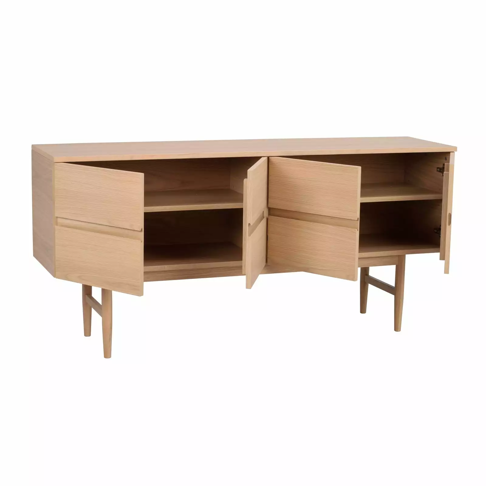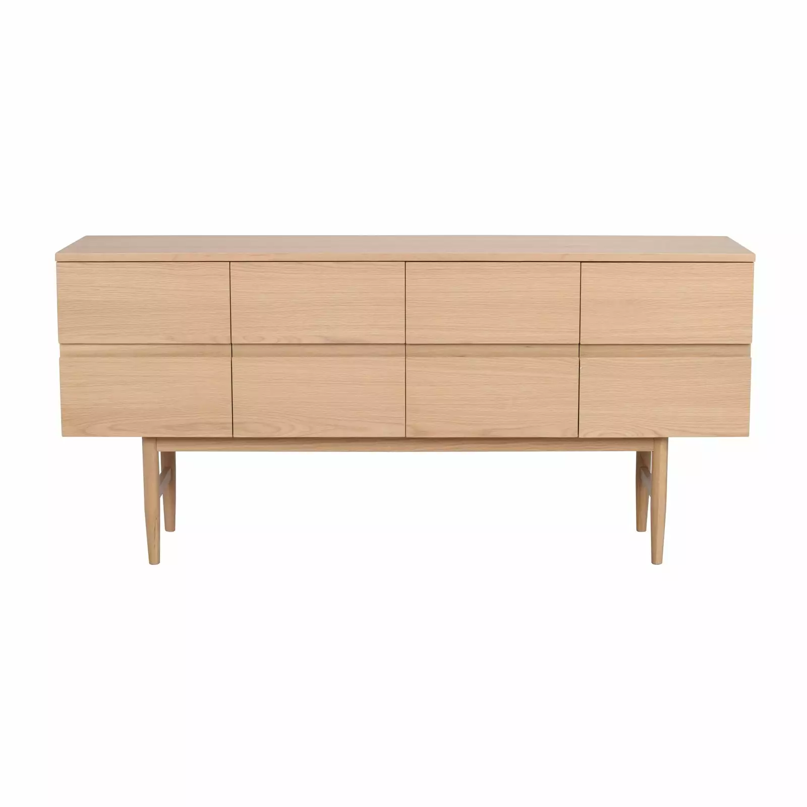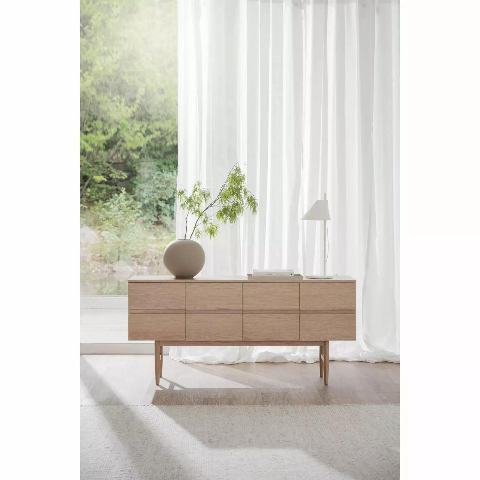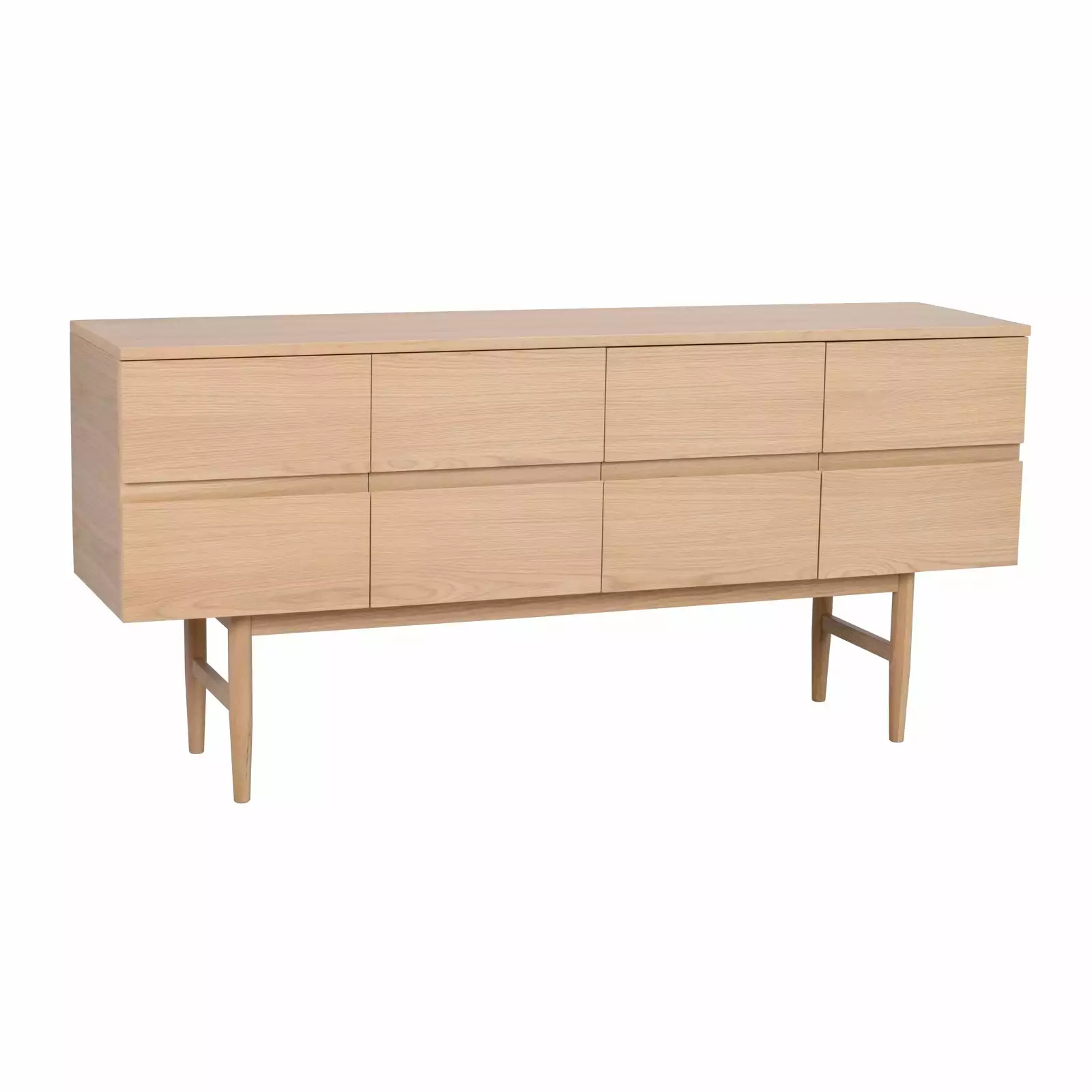 Moresby-senkki on näyttävä säilytyskokonaisuus, joka sopii sekä moderniin että perinteisempään kotiin. Matala sivutaso on valmistettu vaaleaksi lakatusta MDF-tammiviilusta ja sen ohuet puujalat tuovat muuten jykevään säilytyskalusteeseen ilmavuutta ja keventävät ulkoasua, sekä helpottavat siivousta.