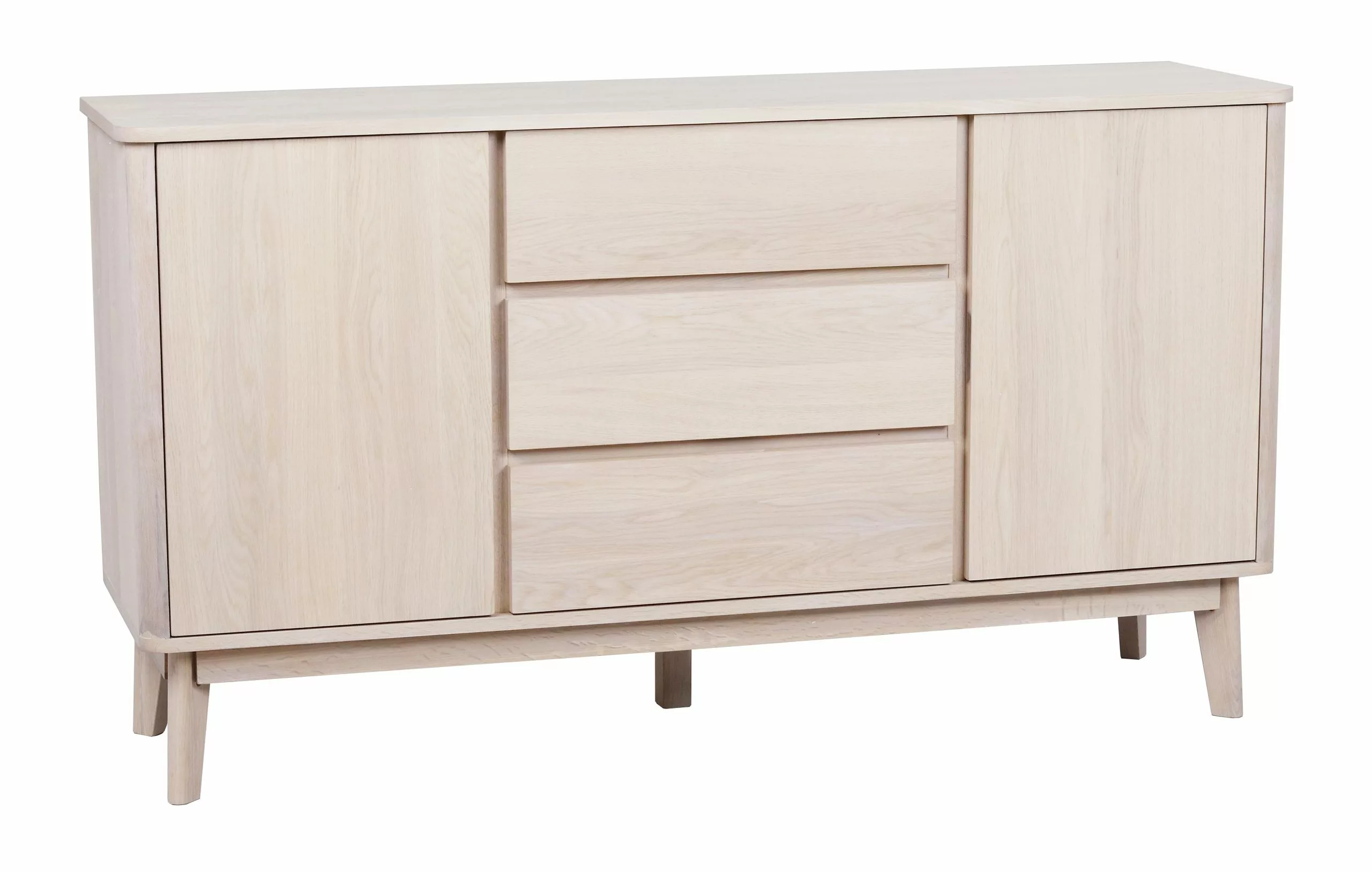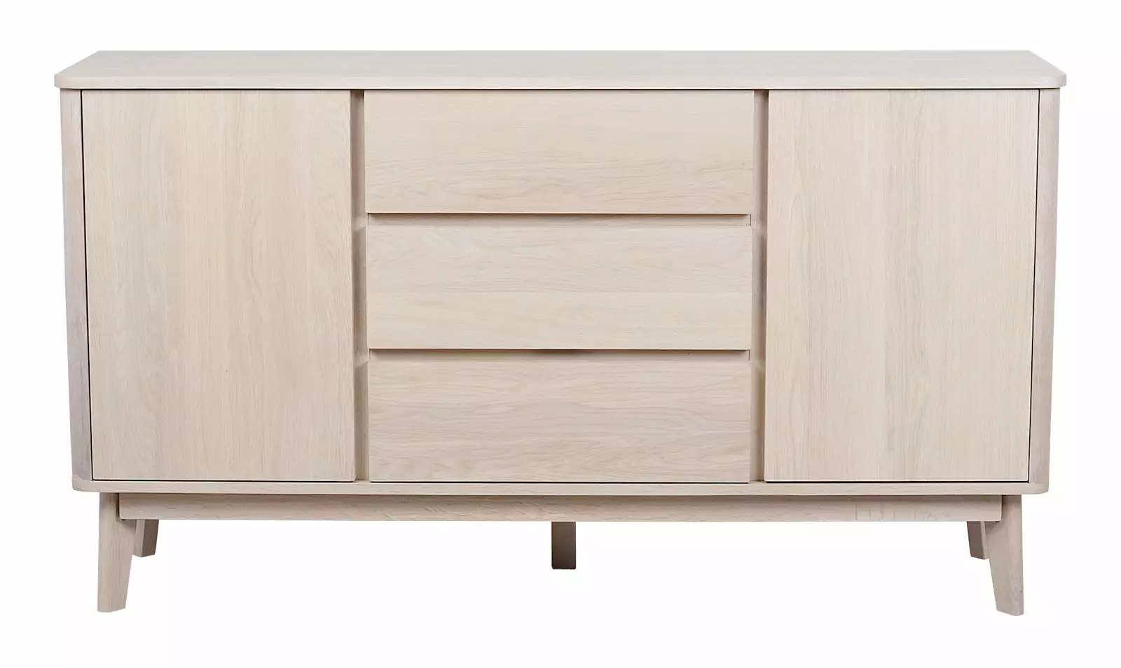 Sulavalinjaisessa säilytysratkaisussa ei ole vetimiä ollenkaan, vaan laatikoissa, sekä kahdessa ovessa on Soft-close -mekanismit, joiden ansiosta ne myös sulkeutuvat pehmeästi. Puiset, hieman viistot korkeat jalat keventävät kokonaisuuden ilmettä ja helpottavat myös kalusteen alta siivoamista.