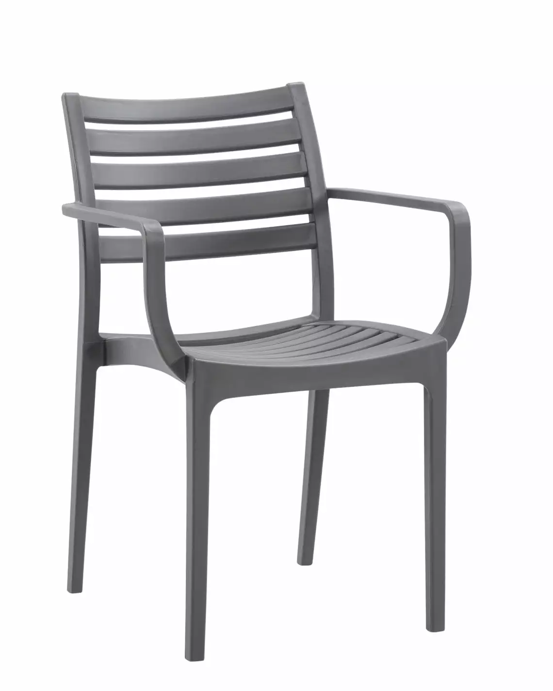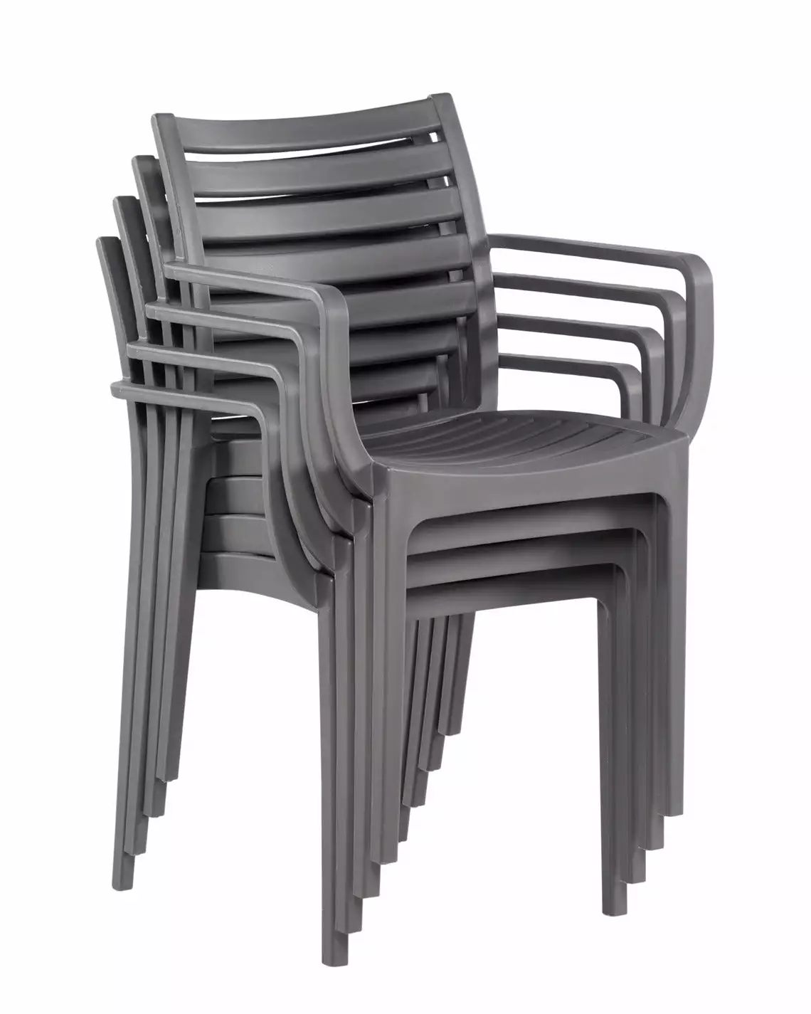 Käsinojallinen Evita-muovituoli soveltuu käytettäväksi sekä sisä- että ulkotiloihin. Tuoli on kevyt ja pinottava, joten se on helppo säilyttää päällekäin pienessäkin tilassa ja ottaa esiin tarvittaessa.