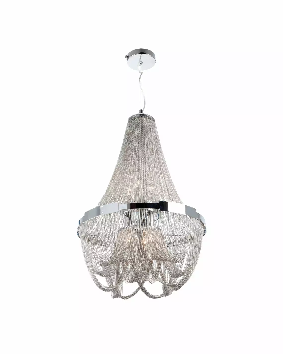 Design by Grönlundin upea Fountain-kattovalaisin on näyttävä riippuvalaisin, joka sopii keskipisteeksi isompaankin tilaan. Valaisimen varjostin muodostuu mattapintaisista hopeaketjuista ja rungon kiiltävä kromipinnoite viimeistelee tyylin.