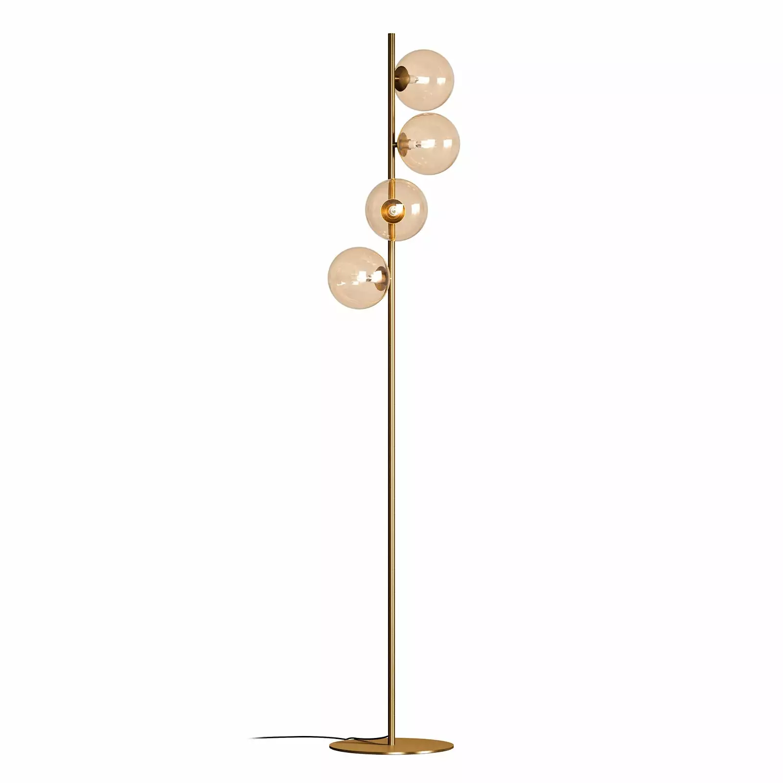 Upeassa Glasgow-lattiavalaisimessa kauniit pallonmuotoiset lasikuvut kiertävät valaisimen metallirunkoa pystysuunnassa. Persoonallisen ja näyttävän Glasgow-lattiavalaisimen ympärillä on neljä värillistä valokupua, joiden läpi valo heijastuu kauniisti huoneeseen. Messingin värisessä lattiavalaisimessa on samppanjan sävyiset lasikuvut ja mustassa valaisimessa on tummanharmaat savulasikuvut. Huomiota herättävä lattiavalaisin sopii lisävaloksi esimerkiksi olohuoneeseen tai tunnelmavaloksi makuuhuoneeseen.