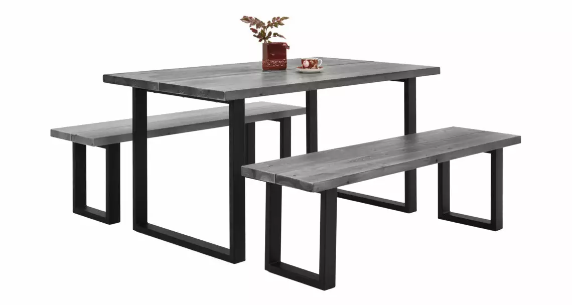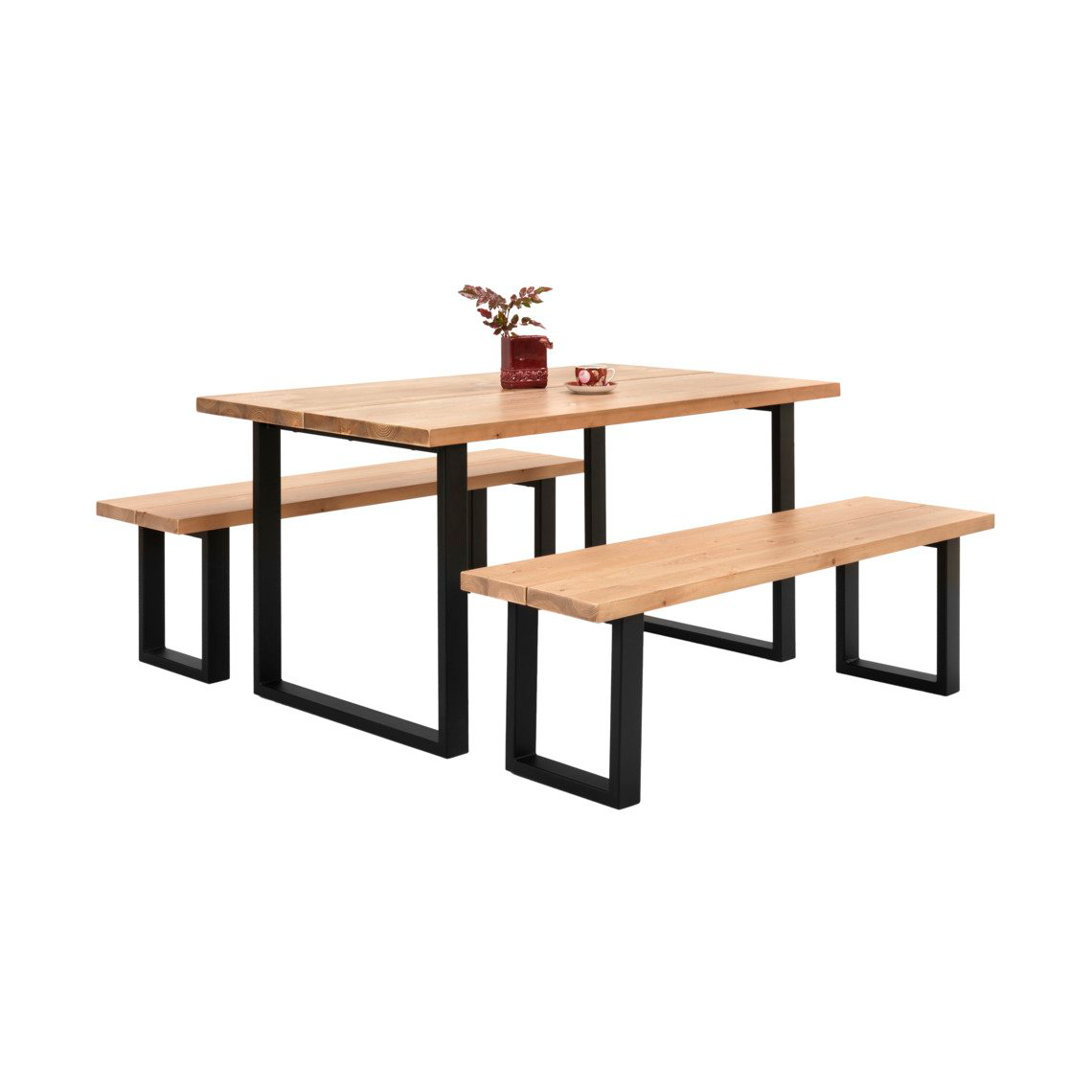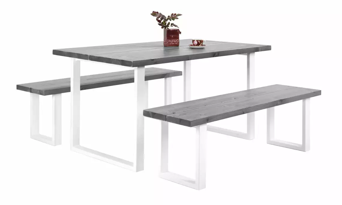 Upea Venla-penkkiryhmä on nykyaikainen versio perinteisestä pirttikalustosta. Se on näyttävä ilmestys ja sopii sekä sisä- että ulkokäyttöön. Saat räätälöityä mieleisesi version pöydästä ja penkeistä valitsemalla kansivärin sekä jalkamallin ja jalkojen värin. Tässä Venla-penkkiryhmän mallissa on suorat metallijalat. Kahdesta lankusta valmistettu pöydänkansi ja penkin istuin ovat vahattua ja harjattua massiivimäntyä.